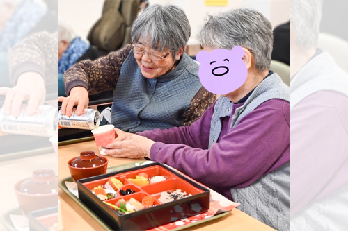 1月1日当日は、施設管理者による新年の挨拶と乾杯の音頭で賑やかに幕を開けました。