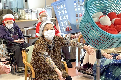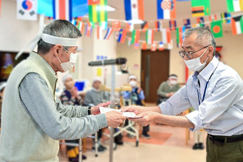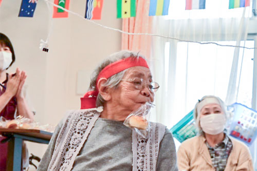 メインの競技は玉入れとパン食い競走! 玉入れでは、皆様の気合が実を結び、66対81と大接戦の末、白組が高得点を獲得しました。続くパン食い競走でも8対7と僅差で紅組も奮闘し、会場は大いに盛り上がりました。玉入れとパン食い競走の点数を合算した結果、栄えある第1回秋の大運動会の優勝は、白組のご利用者様となりました!紅組も74対88と、最後まで熱い戦いを繰り広げてくださり、本当に素晴らしい運動会となりました。