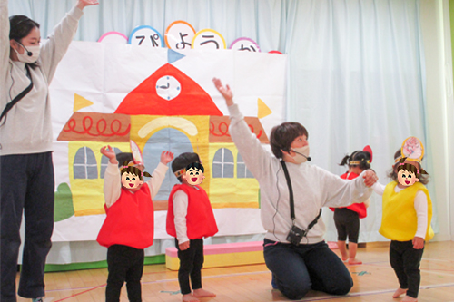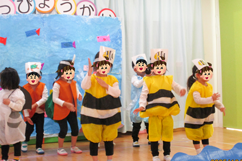 絵本のお話を取り入れたり、普段から楽しんでいる、ふれあい遊びや手遊びを入れた乳児クラスの発表は、とても可愛らしく保護者の方からもたくさんの拍手をいただきました。