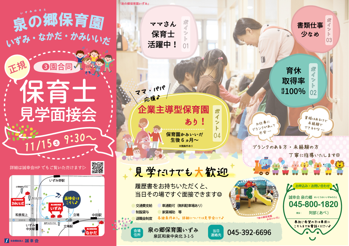保育士見学面接会を11/15㈯開催します(泉の郷保育園いずみ・なかだ・かみいいだ)